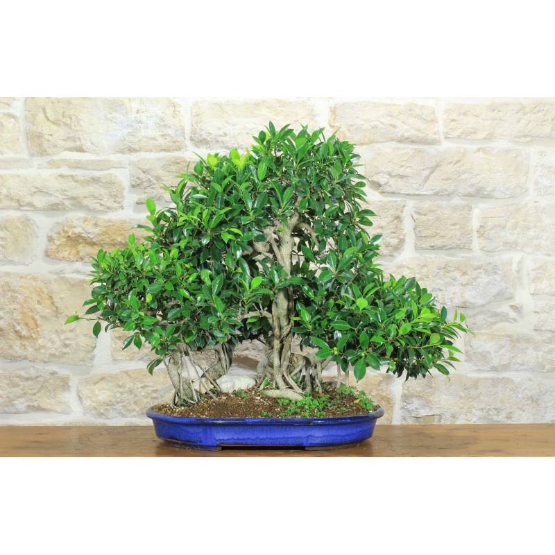 Hain aus Ficus Retusa in ovalem Topf, blau glasiert.