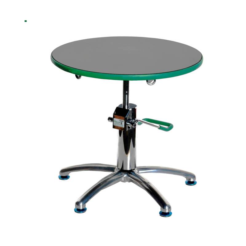 Einstellbare Stützhöhe (Minimum 43 cm - Maximum 60 cm) mit Bremse bremse, die mit einer einfachen Bewegung des Fußpedals gelöst werden kann. 5 abnehmbare Ösen, die sich im unteren Teil des Arbeitstisches befinden, ermöglichen eine feste Verankerung der Anlage auf dem Tisch während der Bearbeitung.