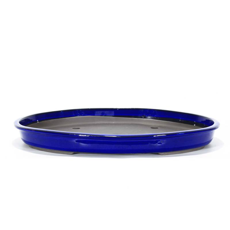 Blau emaillierte, ovale Bonsaischale. Dieses niedrige Modell ist ideal für umgedrehte Besenbonsai oder Hainchen.