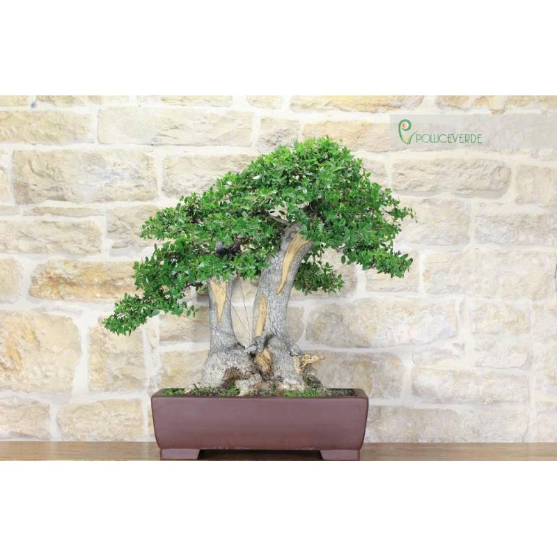 Phyllirea Yamadori Bonsai (Phyllirea Latifolia) im rechteckigen Topf aus Natursteinzeug.