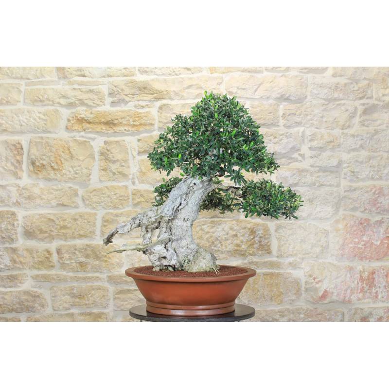 Olivenbonsai (Olea Europea) im runden Topf aus Natursteinzeug.
