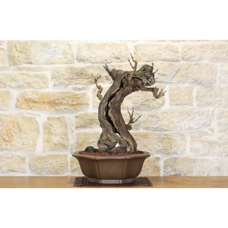 Weinbonsai (Vitis Vinifera) in einem achteckigen Topf aus Natursteinzeug.
