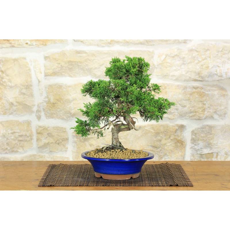 Wacholderbonsai (Juniperus Chinensis) der Sorte Itoigawa, in runder, blau emaillierter Schale.