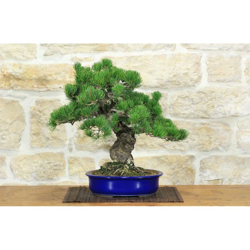 Weißkiefer Bonsai (Pinus Pentaphylla) in ovalen Topf, blau emailliert.