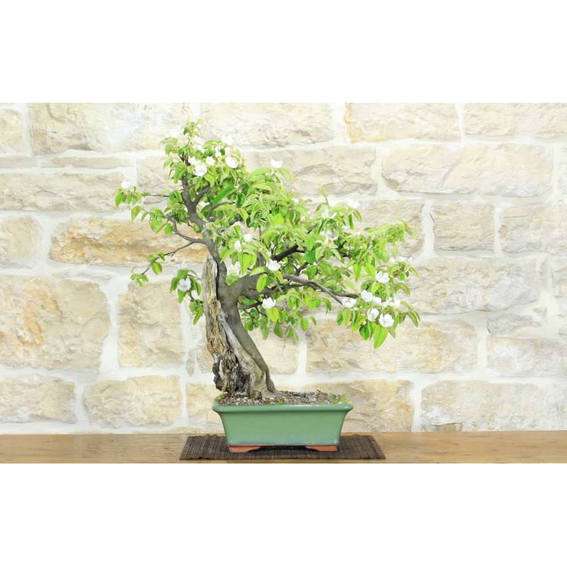 Quitte Bonsai (Cydonia Oblonga) in einem rechteckigen Topf, grün glasiert.