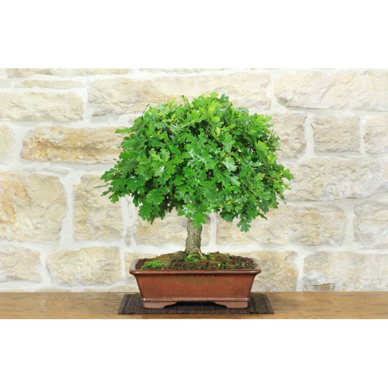 Bonsai-Eiche (Quercus Pubescens) in einem rechteckigen Topf, bronzefarben emailliert.