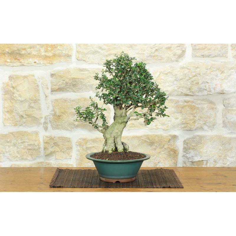 Olea Oleaster Bonsai (Olea Oleaster) im runden Topf, grün glasiert.