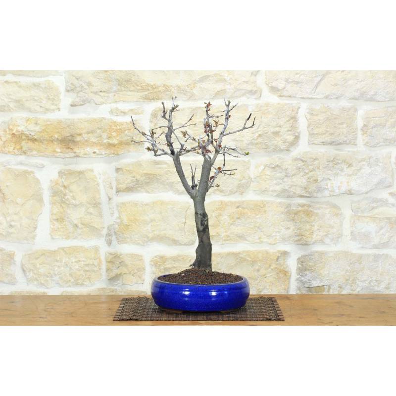 Prunus Pissardii Bonsai (Prunus Pissardii) in einem runden Topf, glasiert in blauer Farbe.