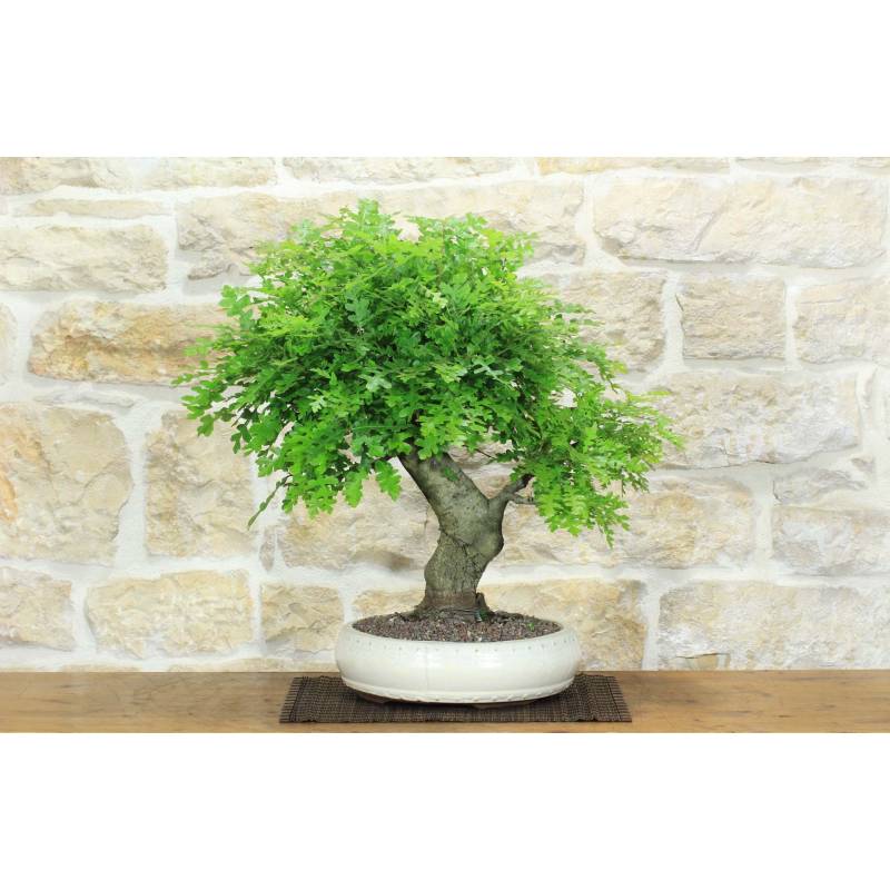 Flaumeichen-Bonsai (Quercus pubescens) in einem runden, elfenbeinfarbenen glasierten Topf.