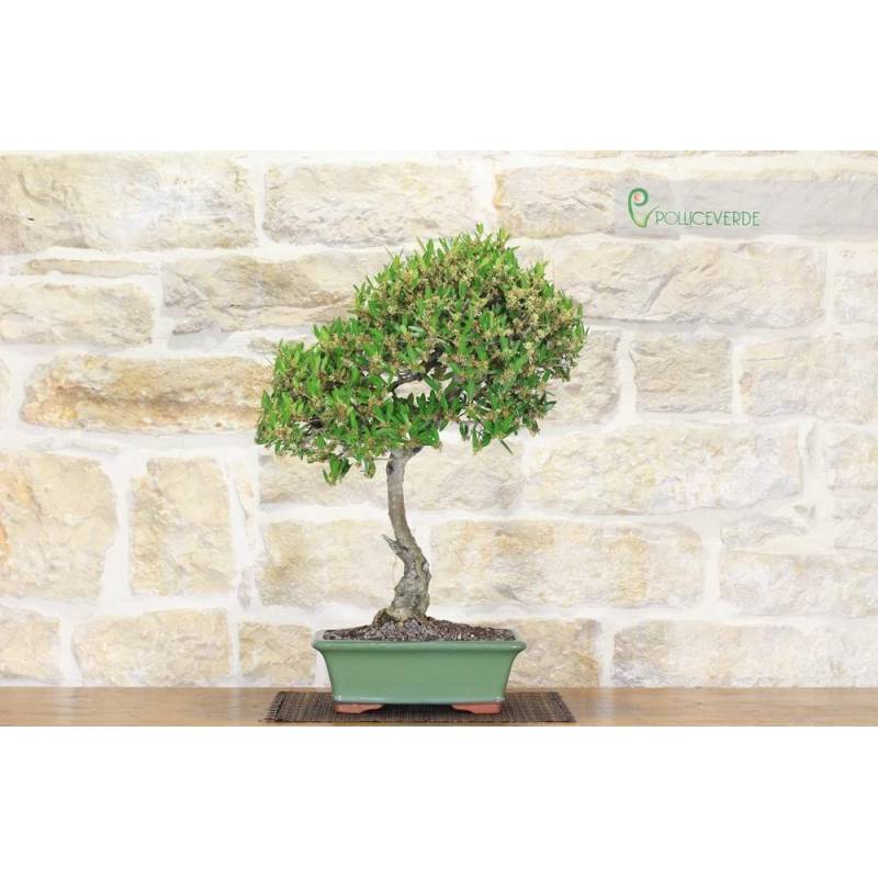 Phillyrea-Bonsai (Phillyrea Angustifolia) in einer rechteckigen, grün glasierten Schale.