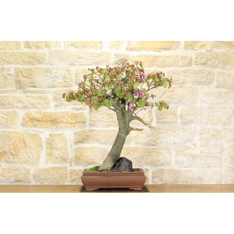 Cercis-Bonsai (Cercis Siliquastrum), allgemein Judasbaum genannt, in rechteckigem Topf aus Natursteinzeug.