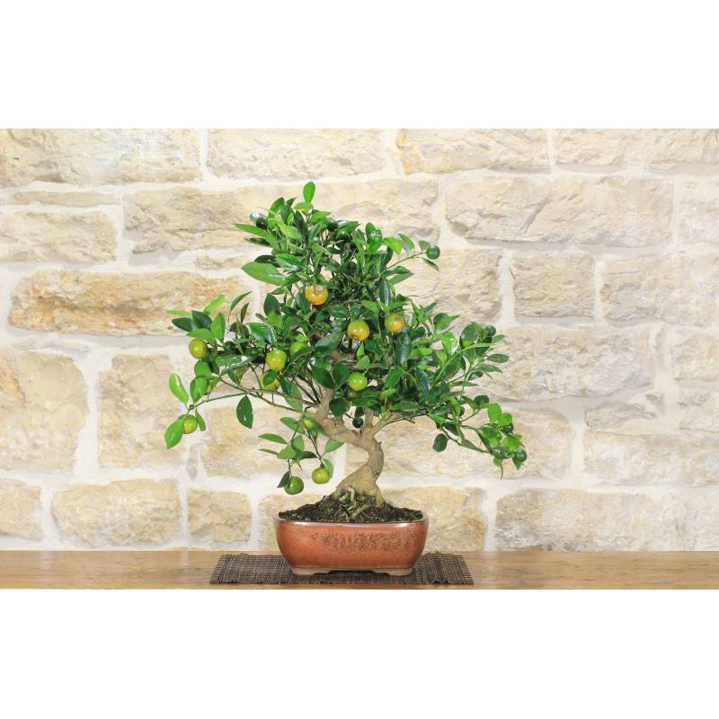 Calamondino-Bonsai (Citrus Microcarpa) im rechteckigen Topf, bronzefarben emailliert.