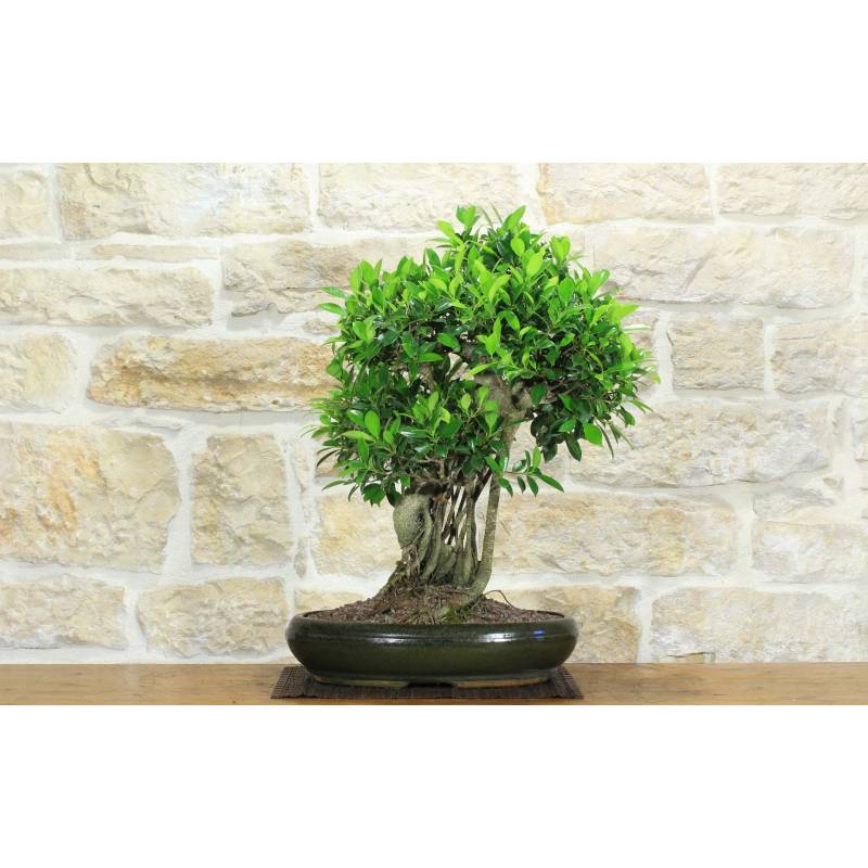 Ficus Retusa bonsai tree in oval pot, glazed green.