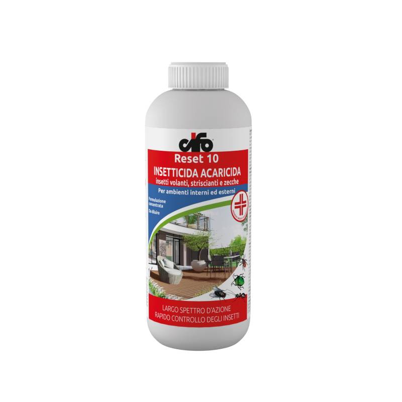 RESET 10 is a broad-spectrum insecticide and acaricide to be diluted in water that acts on flying and crawling insects and ticks. Thanks to its formula, it is an ideal product both for the phytosanitary treatment of plants and for the disinfestation of civil and industrial areas, both internal and external.