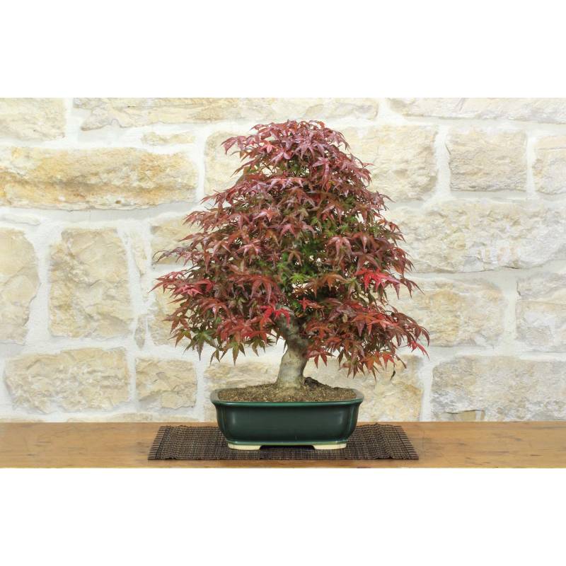 Deshojo Maple bonsai (Acer Palmatum Deshojo) in a rectangular, green glazed pot.