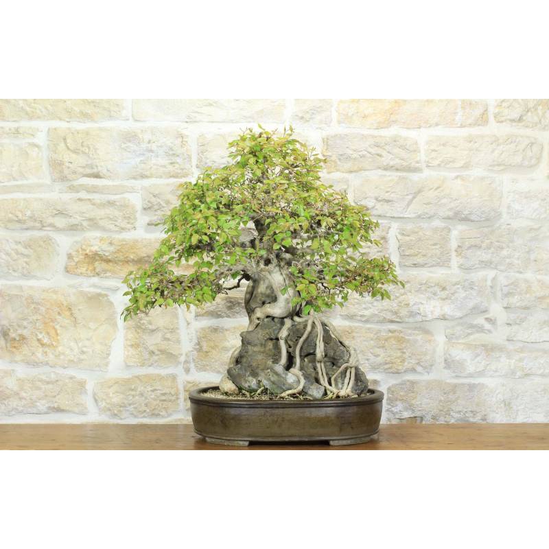 This Carpinus coreana is a specimen that captures your attention at first glance: the long, sinuous roots wrap around a large natural rock before plunging into the substrate, recreating a miniature mountain landscape that is truly breathtaking. The Korean hornbeam is a species highly valued in bonsai for its small leaves and bark that, over time, takes on a mature, weathered appearance — and in this approximately 40-year-old specimen, these qualities are particularly evident.