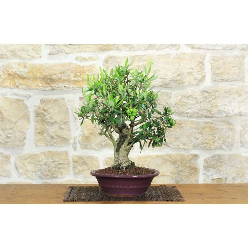 Olive (Olea Europea) bonsai tree in a round, plum-colored glazed pot.