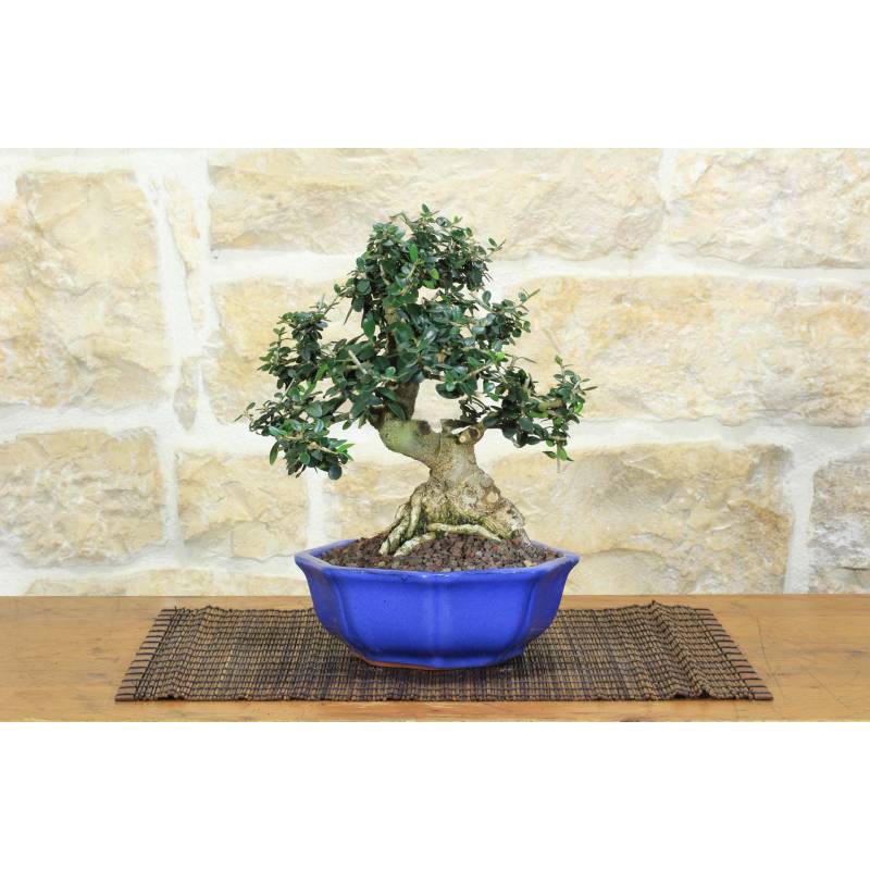 Olive tree (Olea Oleaster) bonsai in octagonal pot, glazed blue...