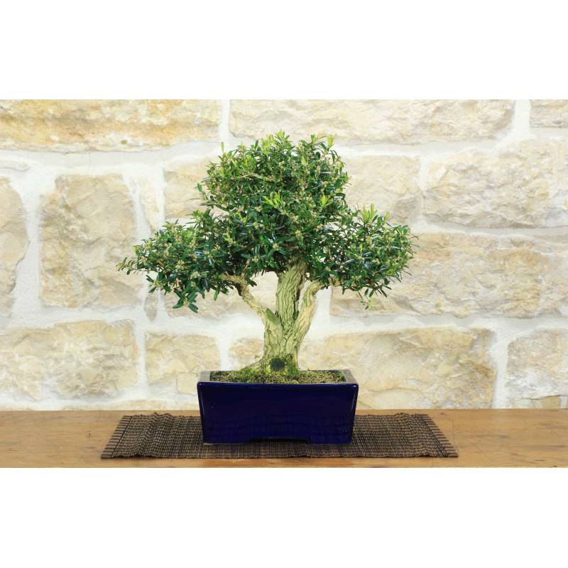 Boxwood bonsai (Buxus harlandii) in rectangular pot, glazed blue.