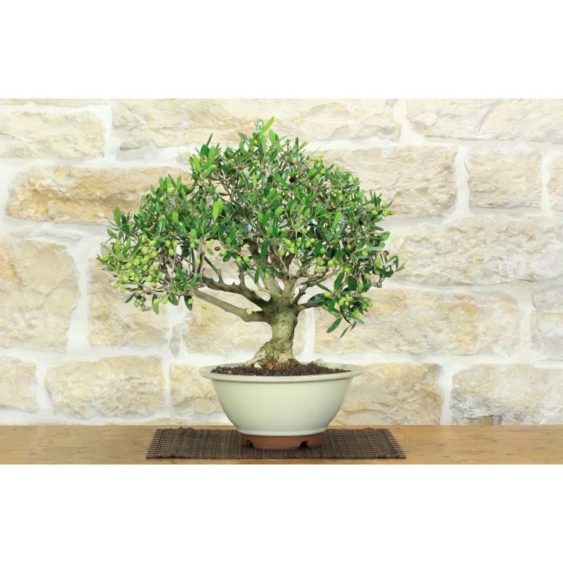 Olive (Olea Europea) bonsai tree in round pot, glazed ivory.