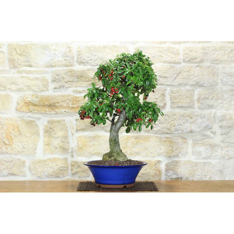 Bonsai of Pyracantha Coccinea var. Red Column, in round pot, glazed blue.