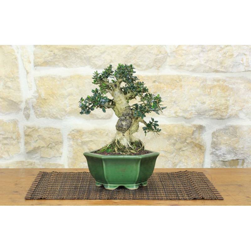 Olive tree (Olea Oleaster) bonsai in hexagonal pot, glazed green.