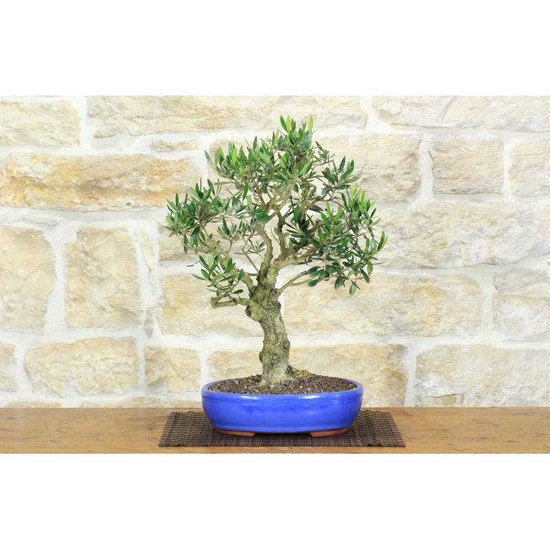Olive (Olea Europea) bonsai tree in oval pot, glazed blue.