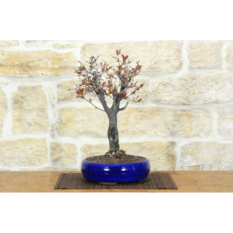 Prunus Pissardii (Prunus Pissardii) bonsai tree in a round pot, glazed in blue color.
