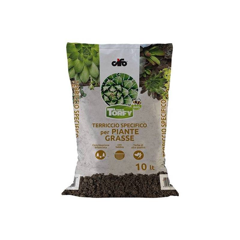 Specific soil for succulent and succulent plants TORFY in 10 lt pack. ideal for growing all succulent plants such as Aloe, Agave, Crassula, Echeveria, Opuntia, Mamillaria, Kalanchoe, etc. The mix of blond peat of sphagnum, sand, black peat and river sand, ensures the right level of humidity and porosity, avoiding harmful water stagnation and soil compaction. The fertilizer contained ensures nourishment for the first stages of transplanting supporting rooting