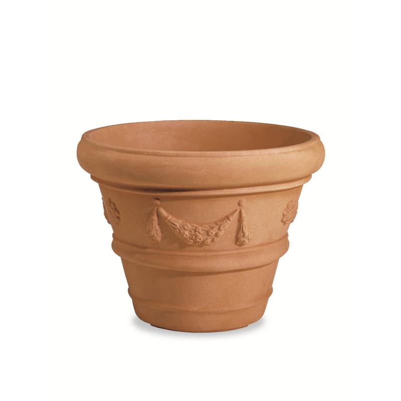Conical circular resin basin, decorated with festoons measuring 87 cm, a classic shape for any type of plant.