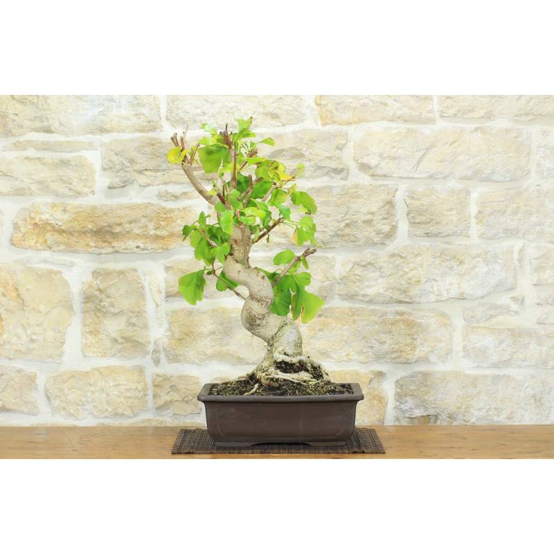 Bonsaï de Ginkgo Biloba, en pot rectangulaire, en grès naturel.