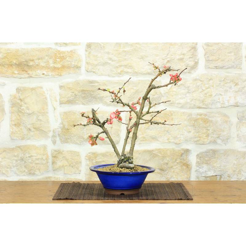 Bonsaï de cognassier japonais (Chaenomeles Chinensis) à fleurs roses dans un pot rond à vernis bleu.