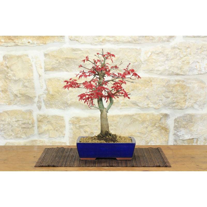 Bonsaï d'érable Deshojo (Acer Palmatum Deshojo) dans un pot rectangulaire à glaçure bleue.