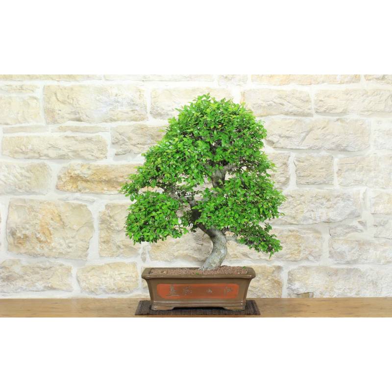 Bonsaï d'orme chinois (Ulmus Chinensis) dans un pot rectangulaire, en grès naturel décoré.