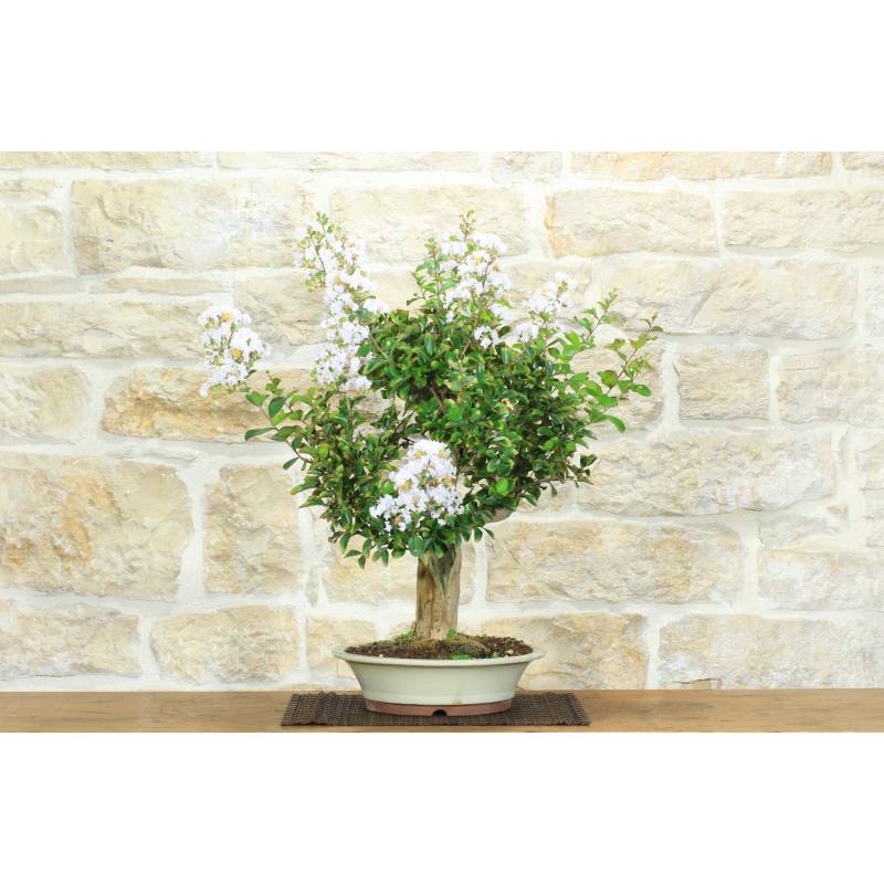 Bonsaï de Lagerstroemia (Lagerstroemia Indica) dans un pot rond, émaillé de couleur ivoire couleur ivoire.