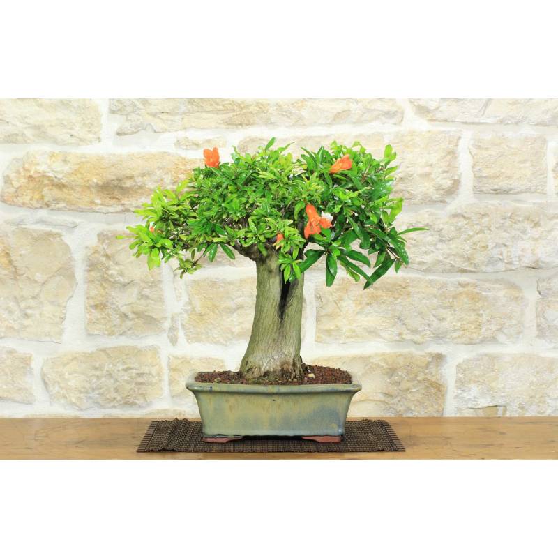 Bonsaï de grenadier (Punica Granatum) dans un pot rectangulaire émaillé vert olive.