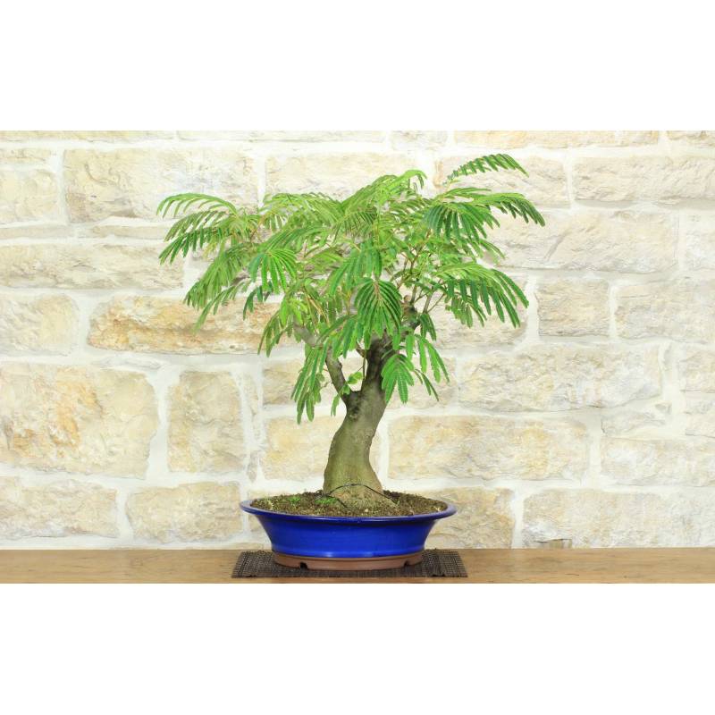 Bonsaï d'Acacia de Constantinople (Albizia Julibrissin) dans un pot rond à vernis bleu.