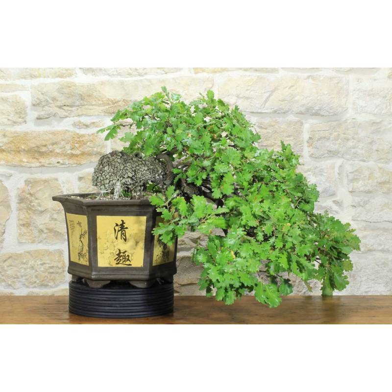 Bonsaï de chêne (Quercus Pubescens) dans un pot rsagonal, en grès naturel décoré.