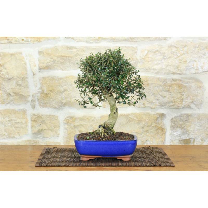 Bonsaï d'Olea Oleaster (Olea Oleaster) dans un pot rectangulaire, émaillé bleu.