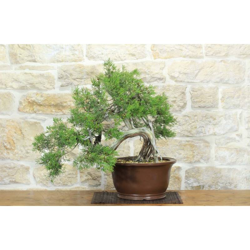 Bonsaï de genévrier de Phénicie (Juniperus Phoenicea) dans un pot rond en grès naturel.