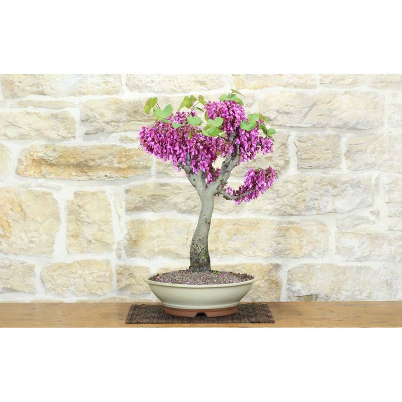 Cercis bonsaï (Cercis Siliquastrum) communément appelé arbre de Judas, dans un pot rond émaillé couleur ivoire.