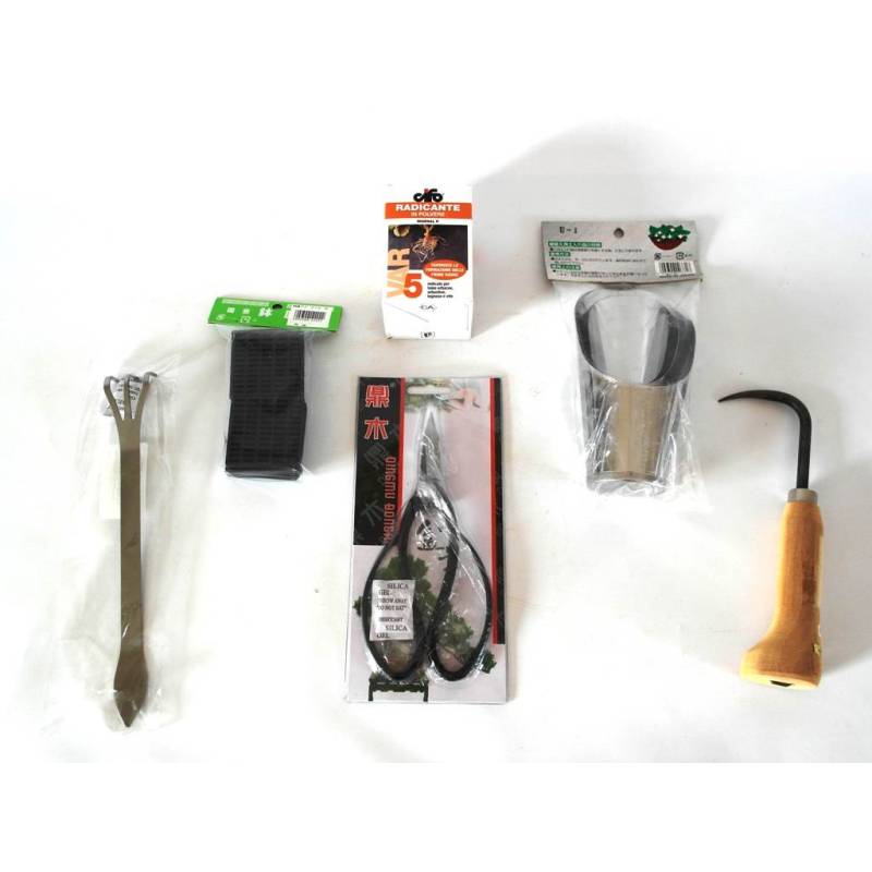 Kit composé de 6 outils et produits très utiles pour rempoter votre bonsaï.