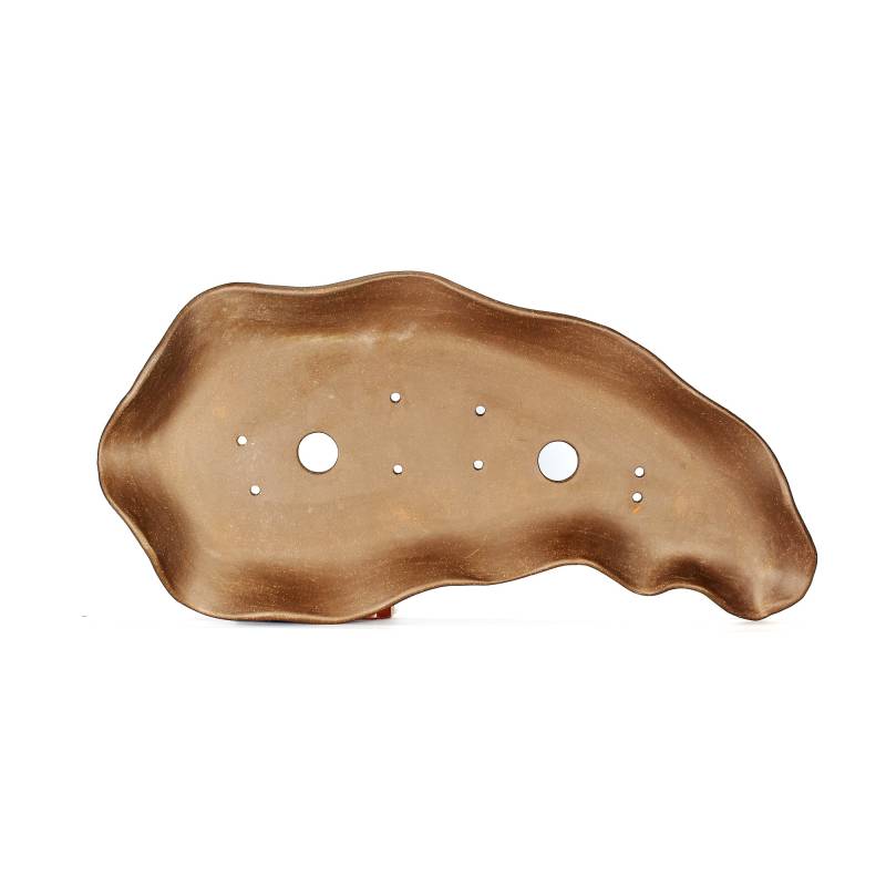 Dalle en grès pour bosquet de bonsaï de 27 cm avec des bords recourbés et avec la queue la plus étroite pointant vers la droite comme vous pouvez le voir sur la photo.