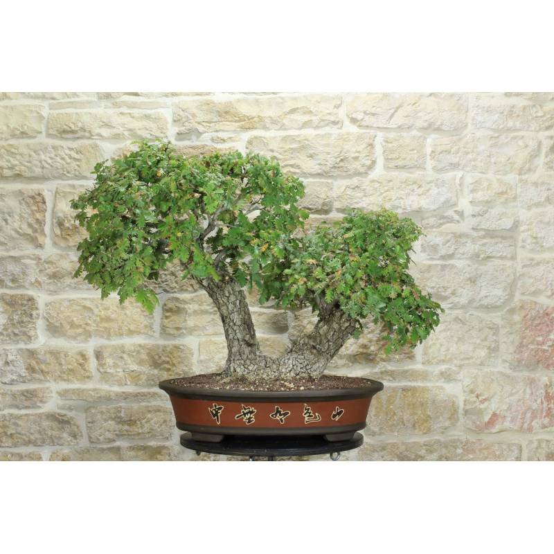 Bonsai di Quercia Roverella (Quercus Pubescens) in vaso ovale, in gres naturale decorato.