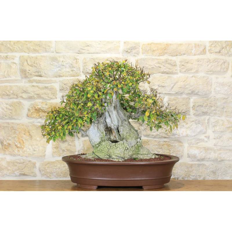 Bonsai di Olmo Campestre (Ulmus Minor) in vaso ovale, in gres naturale.
