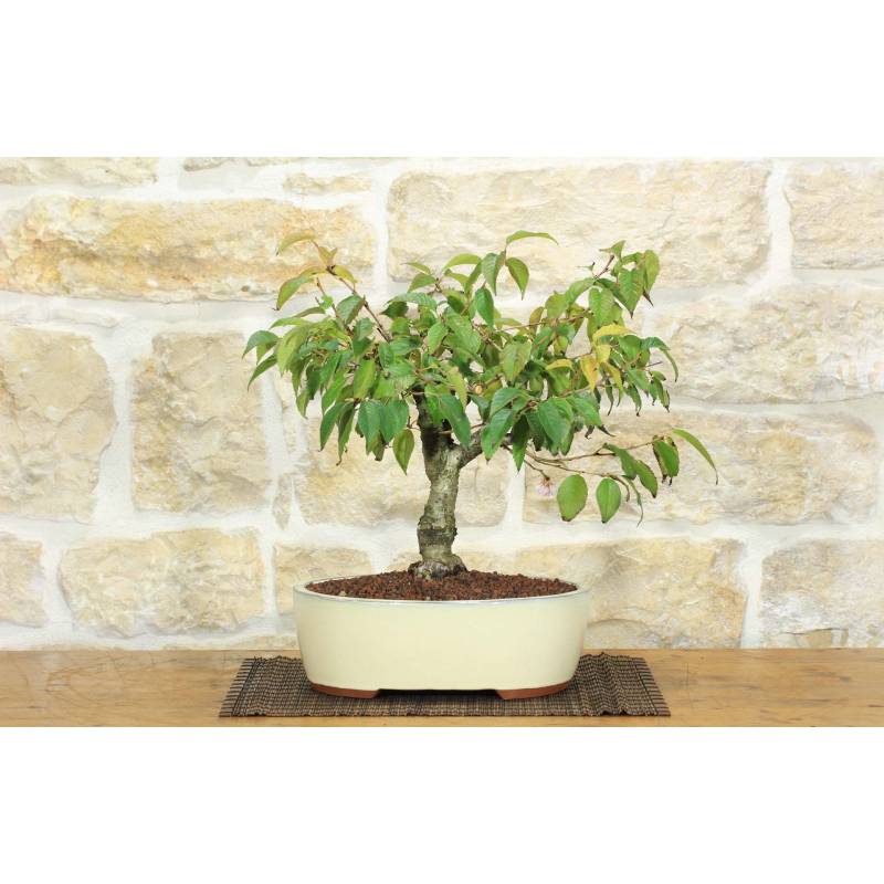 Bonsai di Ciliegio da fiore Subhirtella pendula (Prunus Subhirtella) in vaso ovale, smaltato di colore avorio.