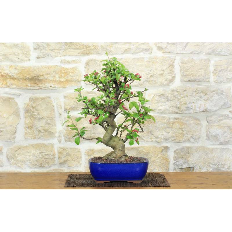 Bonsai di Melo selvatico (Malus Cerasifera) in vaso rettangolare, smaltato di colore blu.