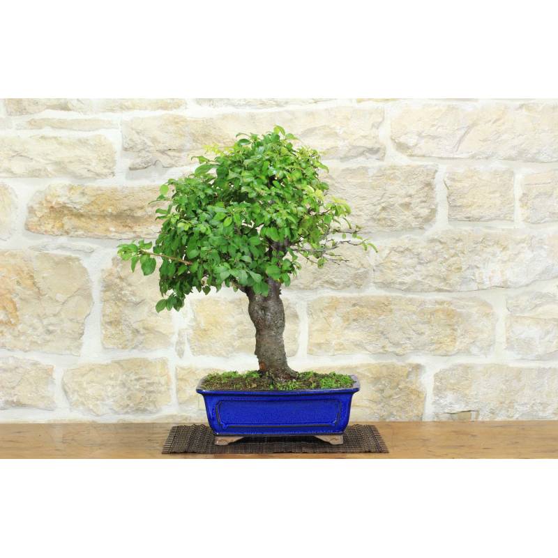 Bonsai di Mirabolano - Prugno Selvatico (Prunus Cerasifera) var. Myrabolanus in vaso rettangolare, smaltato di colore blu.