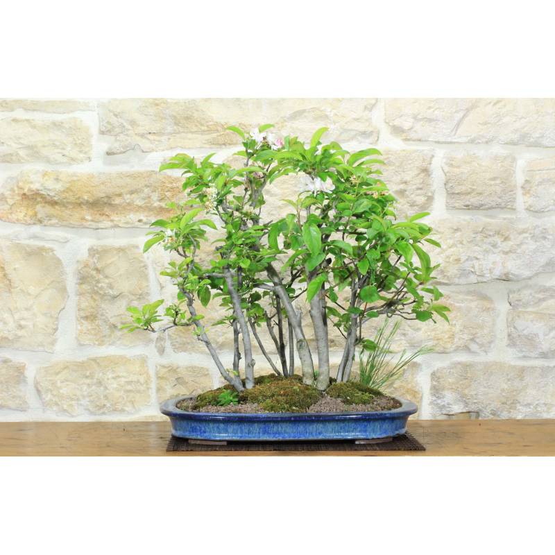 - Bonsai di Melo da fiore (Malus floribunda) boschetto 5 tronchi in ciotola ovale ceramica smaltata blu — esemplare esatto della foto